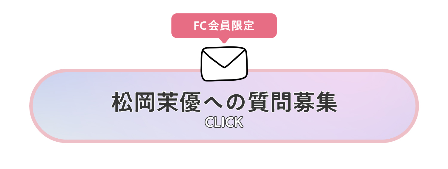 2025.09.09 松岡茉優への質問募集《FC会員限定》 FC会員の皆さんから松岡茉優への質問を募集します! 松岡茉優に聞いてみたかったことはもちろん、日々の発見やプチ相談室など? ぜひお寄せください! ※ニックネームや質問内容は、ファンクラブコンテンツや公式SNSなどで紹介させていただく場合がございます。 ※すべての質問にお答えできるわけではありませんので、予めご了承ください。 一覧に戻る
